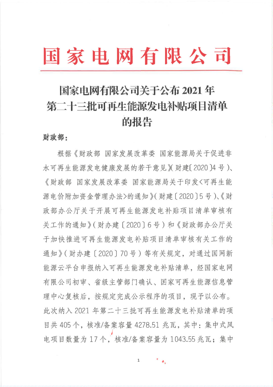 關(guān)于公布2021年第二十三批可再生能源發(fā)電補(bǔ)貼項(xiàng)目清單的公告 根據(jù)《財(cái)政部 國家發(fā)展改革委 國家能源局關(guān)于促進(jìn)非水可再生能源發(fā)電健康發(fā)展的若干意見》(財(cái)建〔2020〕4號)、《財(cái)政部 國家發(fā)展改革委 國家能源局關(guān)于印發(fā)<可再生能源電價(jià)附加資金管理辦法>的通知》(財(cái)建〔2020〕5號)、《...