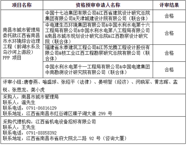 2021年11月19日,江西省機電設備招標有限公司關于江西省南昌市水環(huán)境綜合治理工程(前湖水系及烏沙河上游段)PPP 項目(招標編號:JXTC2021020278)資格預審結果公示 江西省機電設備招標有限公司受南昌市城市管理局委托就江西省南昌市水環(huán)境綜合治理工程(前湖水系及烏沙河上游段)PPP 項目...