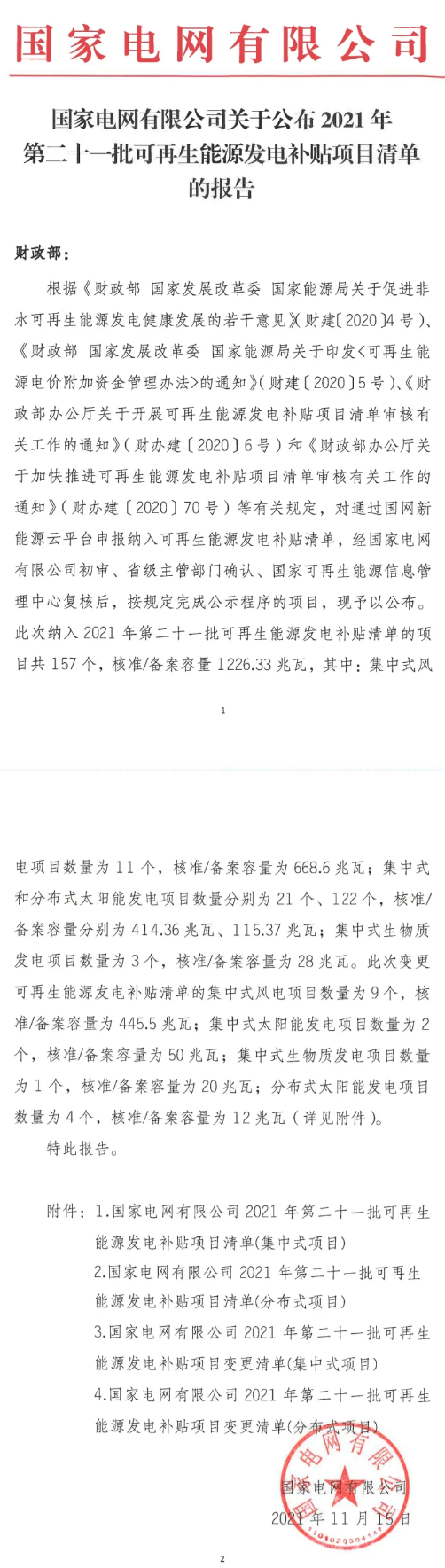 關(guān)于公布2021年第二十一批可再生能源發(fā)電補(bǔ)貼項(xiàng)目清單的公告 根據(jù)《財(cái)政部 國家發(fā)展改革委 國家能源局關(guān)于促進(jìn)非水可再生能源發(fā)電健康發(fā)展的若干意見》(財(cái)建〔2020〕4號)、《財(cái)政部 國家發(fā)展改革委 國家能源局關(guān)于印發(fā)<可再生能源電價(jià)附加資金管理辦法>的通知》(財(cái)建〔2020〕5號)、《...