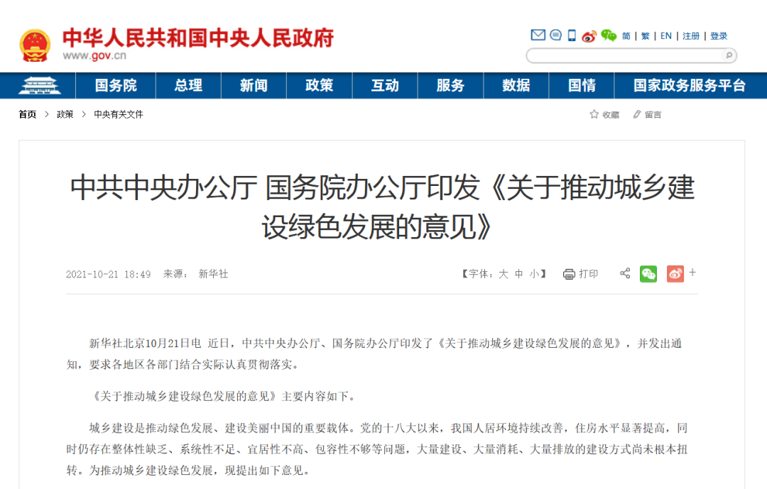 文章導讀《意見》提出,到2035年,城鄉(xiāng)建設全面實現(xiàn)綠色發(fā)展,碳減排水平快速提升,城市和鄉(xiāng)村品質全面提升,人居環(huán)境更加美好,城鄉(xiāng)建設領域治理體系和治理能力基本實現(xiàn)現(xiàn)代化,美麗中國建設目標基本實現(xiàn)。新華社北京10月21日電 近日,中共中央辦公廳、國務院辦公廳印發(fā)了《關于推動城鄉(xiāng)建設綠色發(fā)展的意見》,并...