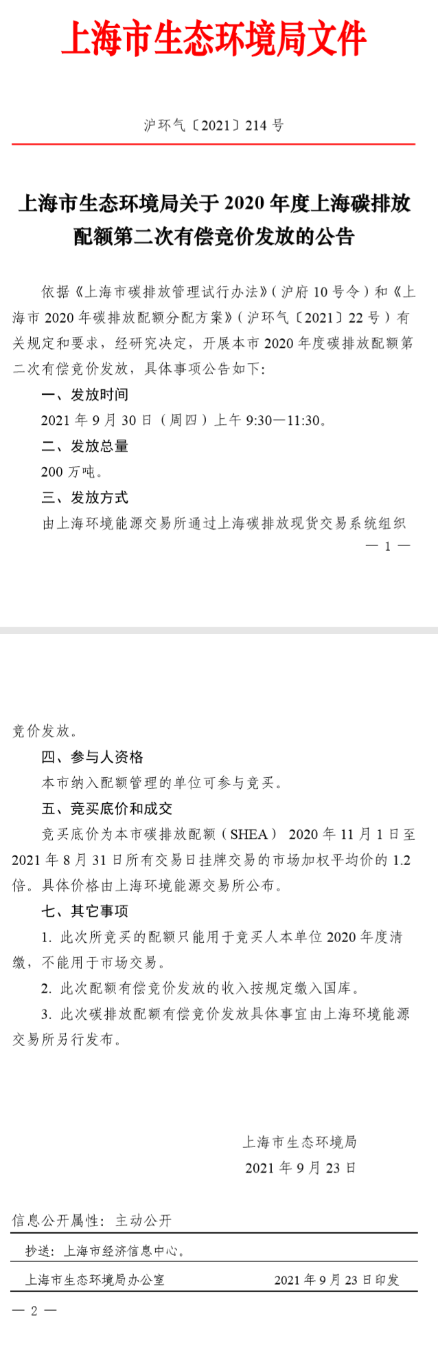 上海市生態(tài)環(huán)境局關于2020年度上海碳排放配額第二次有償競價發(fā)放的公告 滬環(huán)氣〔2021〕214號 依據《上海市碳排放管理試行辦法》(滬府10號令)和《上海市2020年碳排放配額分配方案》(滬環(huán)氣〔2021〕22號)有關規(guī)定和要求,經研究決定,開展本市2020年度碳排放配額第二次有償競價發(fā)放,具體事...
