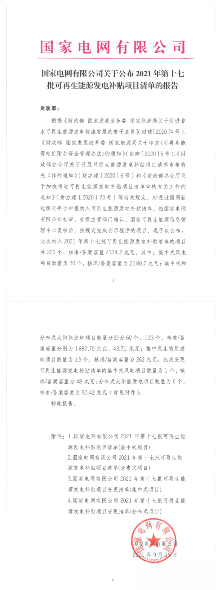 關(guān)于公布2021年第十七批可再生能源發(fā)電補(bǔ)貼項(xiàng)目清單的公告 根據(jù)《財(cái)政部 國家發(fā)展改革委 國家能源局關(guān)于促進(jìn)非水可再生能源發(fā)電健康發(fā)展的若干意見》(財(cái)建〔2020〕4號)、《財(cái)政部 國家發(fā)展改革委 國家能源局關(guān)于印發(fā)<可再生能源電價(jià)附加資金管理辦法>的通知》(財(cái)建〔2020〕5號)、《財(cái)...