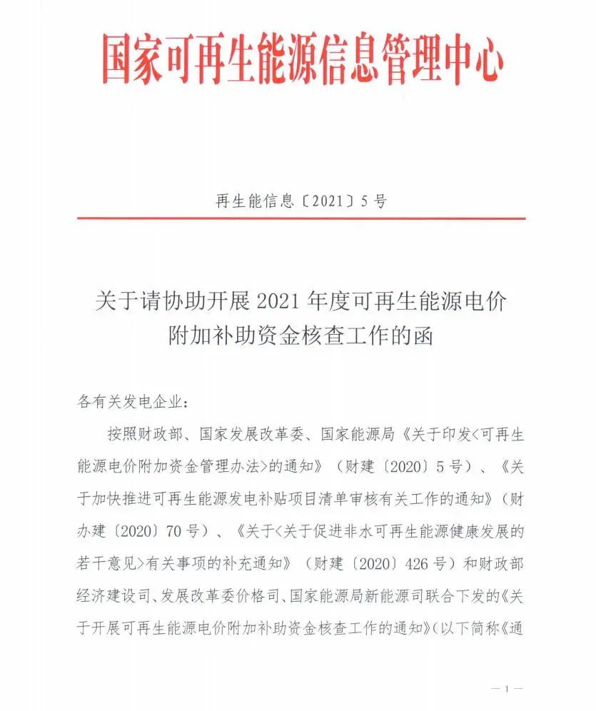 國家可再生能源信息管理中心 再生能信息〔2021〕5號 關于請協(xié)助開展2021年度可再生能源電價附加補助資金核查工作的函各有關發(fā)電企業(yè): 按照財政部、國家發(fā)展改革委、國家能源局《關于印發(fā)<可再生能源電價附加資金管理辦法>的通知》(財建〔2020〕5號)、《關于加快推進可再生能源發(fā)電補貼項...