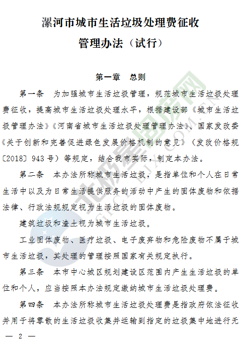 答:《漯河市城市生活垃圾處理費計征收管理暫行辦法》自2005年頒布實施以來已經(jīng)13年。由于當(dāng)時的條件所限以及目前我市的社會經(jīng)濟發(fā)展水平的提高,原文件已經(jīng)不適應(yīng)垃圾處理費的征收和管理。原文件是個暫行管理辦法,有些條文不符合現(xiàn)在的制度要求。因此,這次修訂是參照原來文件的部分內(nèi)容,結(jié)合我市現(xiàn)在的實際情況,依據(jù)國家、省有關(guān)文件規(guī)定出臺的新行政規(guī)范性文件,這樣更有科學(xué)性、規(guī)范性和可操作性。