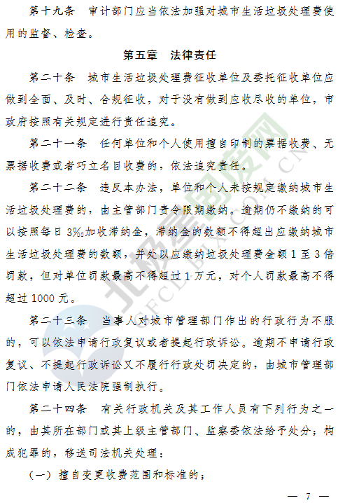 答:違反本辦法,單位和個人未按規(guī)定繳納城市生活垃圾處理費的,由主管部門責(zé)令限期繳納。逾期仍不繳納的可以按照每日千分之三加收滯納金,滯納金的數(shù)額不得超出應(yīng)繳納城市生活垃圾處理費的數(shù)額,并處以應(yīng)繳納垃圾處理費金額1至3倍罰款,但對單位罰款最高不得超過1萬元,對個人罰款最高不得超過1000元。
