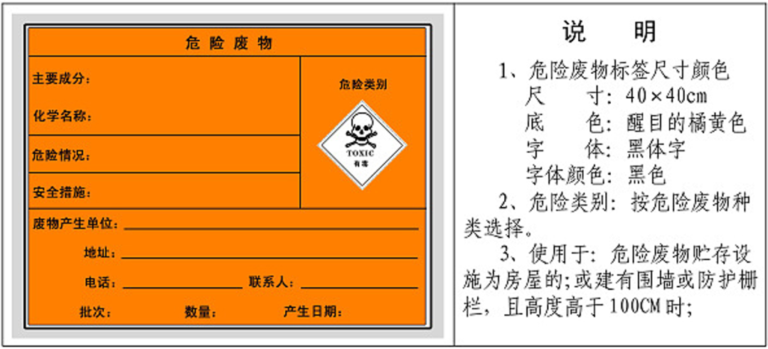 懸掛于危廢貯存間外面門的一側(cè),或獨(dú)立擺放于危廢貯存間外