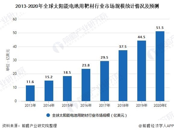 太陽能光伏產(chǎn)業(yè)的快速發(fā)展給太陽能電池用靶材市場帶來了巨大的成長空間。結(jié)合近幾年光伏行業(yè)發(fā)展情況(光伏裝機(jī)量)測算,2020年,全球太陽能電池用靶材市場規(guī)模達(dá)到51.5億美元。