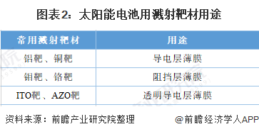 現(xiàn)今,制備太陽能電池較為常用的濺射靶材包括鋁靶、銅靶、鉬靶、鉻靶以及ITO 靶、AZO 靶(氧化鋁鋅,Aluminum Zinc Oxide)等,純度要求一般在99.99%以上。太陽能電池常用濺射靶材用途如下表所示。