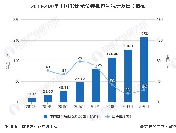 由于擁有較為有利的生產(chǎn)成本優(yōu)勢,我國已經(jīng)成為全球最大的太陽能電池片和電池組件生產(chǎn)制造基地。從2010 年開始,我國的太陽能光伏產(chǎn)業(yè)迎來了井噴式爆發(fā),此后幾年的累計光伏裝機(jī)容量增長率均超過100%。2020年,我國累計光伏裝機(jī)容量達(dá)到253GW,同比增長24%。