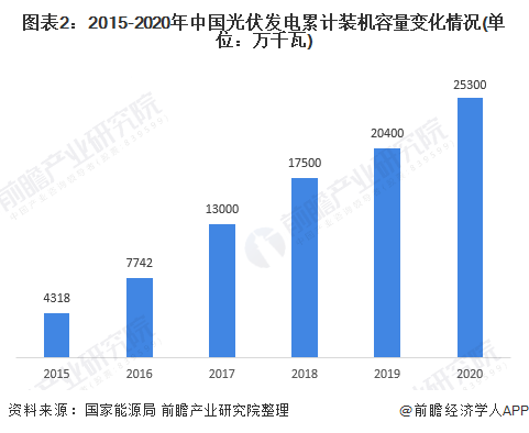 累計(jì)裝機(jī)容量方面,2015年以來,我國光伏發(fā)電累計(jì)裝機(jī)容量增長迅速。2015年,全國光伏發(fā)電累計(jì)裝機(jī)容量為4318萬千瓦,到2020年已經(jīng)增長至25300萬千瓦。從一定程度上說,我國的光伏發(fā)電正在迅速發(fā)展起來。