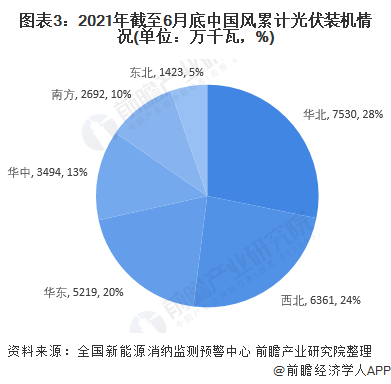 截止2021年6月,華北地區(qū)的累計(jì)光伏裝機(jī)容量達(dá)到7530萬千瓦,占比28%,是全國最高地區(qū)。其次是西北地區(qū)和華東地區(qū),分別累計(jì)光伏裝機(jī)容量為6361萬千瓦和5219萬千瓦,分別占比為24%和20%。