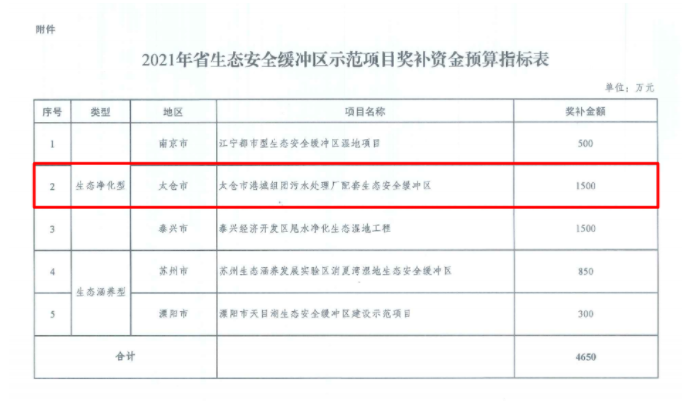 7月5日,省財(cái)政廳、省生態(tài)環(huán)境廳下發(fā)《關(guān)于下達(dá)2021年省生態(tài)安全緩沖區(qū)示范項(xiàng)目獎(jiǎng)補(bǔ)資金的通知》(蘇財(cái)資環(huán)〔2021〕29號(hào)),給予太倉(cāng)市1500萬元生態(tài)安全緩沖區(qū)示范項(xiàng)目獎(jiǎng)補(bǔ)。這是太倉(cāng)市繼2020年獲得“國(guó)家生態(tài)文明建設(shè)示范市”榮譽(yù)后,在生態(tài)文明建設(shè)工作方面再次獲得的兩項(xiàng)殊榮!