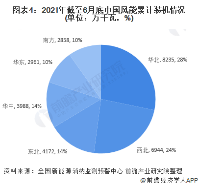 2021年1-6月,華中地區(qū)和華東地區(qū)的新增裝機(jī)容量較多,分別達(dá)到188萬(wàn)千瓦和108萬(wàn)千瓦。截止2021年6月底,華北地區(qū)和西北地區(qū)的風(fēng)能累計(jì)裝機(jī)容量占比超過(guò)全國(guó)一半,分別達(dá)到28%和24%。