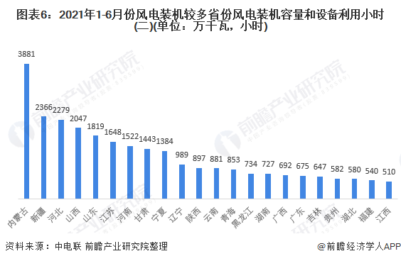 按照裝機(jī)容量來(lái)看,2021年1-6月,內(nèi)蒙古、新疆和河北的裝機(jī)容量位列全國(guó)前三;其中內(nèi)蒙古的風(fēng)能裝機(jī)容量突破3500萬(wàn)千瓦,位列全國(guó)第一。并且有9個(gè)省市的風(fēng)能裝機(jī)容量突破1000萬(wàn)千瓦。