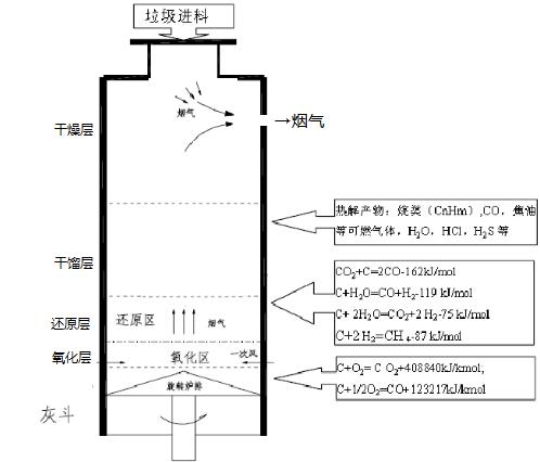 干燥后的垃圾逐漸降至熱解段,在控制的缺氧條件下有機物發(fā)生熱解,生成可燃氣體和灰渣。在熱分解段和氣化燃燒段分解成一氧化碳、氣態(tài)烴類等混合物進入混合煙氣中。熱解氣化后的殘留物(液態(tài)焦油、較純的碳素及垃圾本身含有的無機灰土和惰性物質(zhì)) 進入燃燒層充分燃燒。燃燒層沿高度方向可分為氧化區(qū)和還原區(qū)。