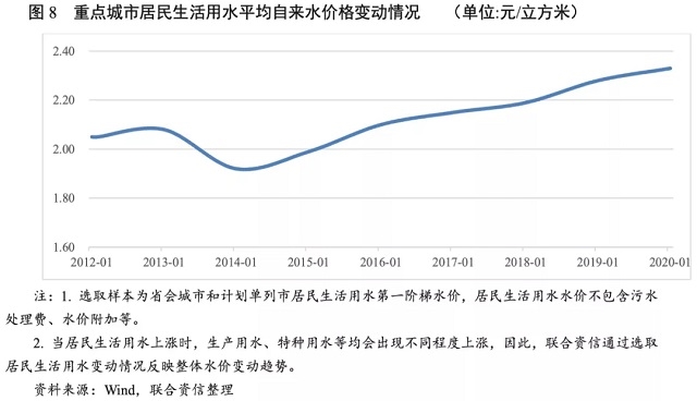 近年來(lái),我國(guó)重點(diǎn)城市居民生活用水價(jià)格整體呈現(xiàn)小幅上漲趨勢(shì),2020年,部分城市居民生活用水價(jià)格進(jìn)一步調(diào)升;水資源匱乏城市水價(jià)格較高;伴隨著水價(jià)改革的推進(jìn)及節(jié)水政策指導(dǎo)下水價(jià)調(diào)控作用的發(fā)揮,預(yù)期城市供水價(jià)格未來(lái)溫和上漲。
