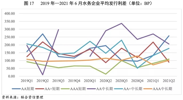 2019年以來(lái),疫情突發(fā)事件及后續(xù)疫情的控制進(jìn)展對(duì)我國(guó)宏觀經(jīng)濟(jì)及貨幣、財(cái)政政策的制定帶來(lái)較大影響,水務(wù)企業(yè)債券發(fā)行利率隨之有所波動(dòng);水務(wù)企業(yè)不同級(jí)別、不同期限發(fā)行利差呈波動(dòng)態(tài)勢(shì)。