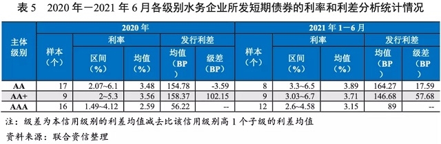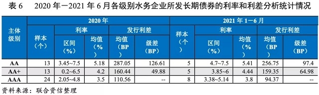 從發(fā)行利差看,水務(wù)企業(yè)債券不同級(jí)別、不同期限發(fā)行利差呈波動(dòng)態(tài)勢(shì)。其中,AAA主體發(fā)行利差波動(dòng)較小,其他企業(yè)發(fā)行利率區(qū)間及利差波動(dòng)較大,主要系水務(wù)企業(yè)樣本企業(yè)偏少,市場(chǎng)認(rèn)可度差異較為明顯,不同時(shí)間段發(fā)行企業(yè)的差異對(duì)發(fā)行利率及利差影響很大。2020年及2021年1——6月,水務(wù)企業(yè)債券不同級(jí)別、不同期限發(fā)行利差詳見(jiàn)下表。