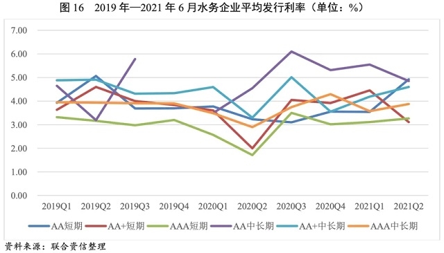2019年至2021年6月,除AA級(jí)別水務(wù)企業(yè)債券發(fā)行利率波動(dòng)上升外,其他級(jí)別水務(wù)企業(yè)所發(fā)行不同期限債券利率均波動(dòng)下降。2020年,水務(wù)企業(yè)短期債券的平均發(fā)行利率為3.16%,較上年的3.80%大幅下降。2021年1——6月,水務(wù)企業(yè)短期債券平均發(fā)行利率(3.53%)較2020年有所上升,且較上年同期平均發(fā)行利率(2.97%)也有所上升。