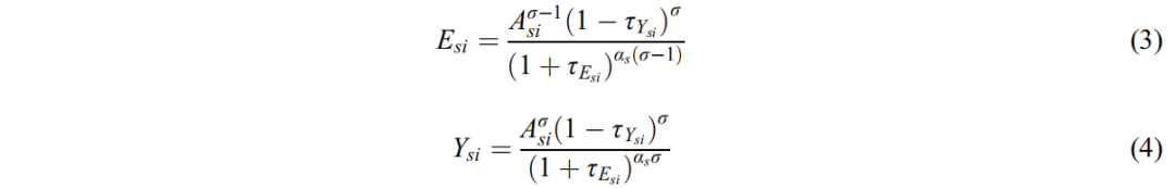 s代表產(chǎn)業(yè);i代表地區(qū);π代表利潤(rùn);τY為產(chǎn)出扭曲;τE為資源扭曲;P為產(chǎn)品價(jià)格;R為資本要素價(jià)格;ω為資源要素價(jià)格。假設(shè)各地區(qū)中間產(chǎn)品部門的生產(chǎn)函數(shù)是不變替代彈性的D-S生產(chǎn)函數(shù)。那么,企業(yè)利潤(rùn)最大化的條件是: