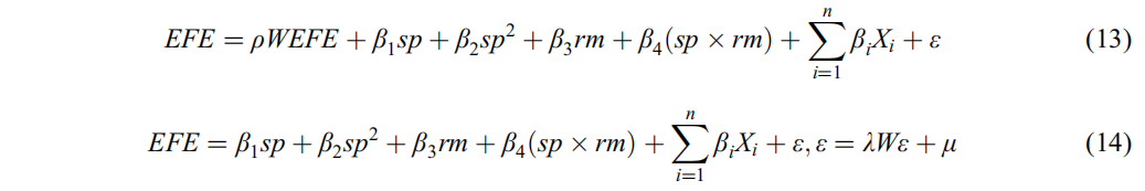 其中,EFE指生態(tài)效率;W為空間權(quán)重矩陣;μ表示隨機(jī)誤差項(xiàng)??刂谱兞堪夹g(shù)發(fā)展水平(tec)、人均土地承載力(ec)、自然人口增長(zhǎng)率(pop)、產(chǎn)業(yè)所有制結(jié)構(gòu)(os)、互聯(lián)網(wǎng)普及率(int)、消費(fèi)水平(CPI)、政府調(diào)控經(jīng)濟(jì)的能力(gfe)、工業(yè)企業(yè)的環(huán)境保護(hù)程度(iep)。