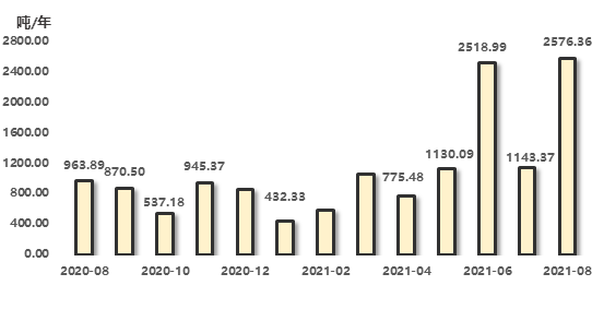 近期排污權成交量短期收窄后,再次攀升高位。2021年8月,四項排污權成交量合計為2576.36噸,環(huán)比上漲125.33%,與上年同期相比上升167.29%。