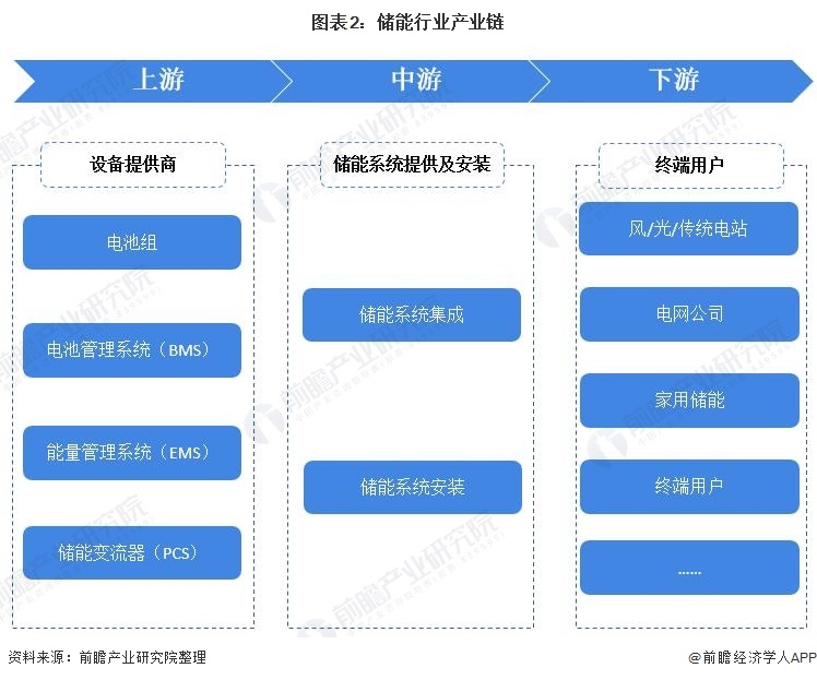 儲(chǔ)能產(chǎn)業(yè)鏈上游為電池、電池管理、能量管理系統(tǒng)以及儲(chǔ)能變流器供應(yīng)商;中游為儲(chǔ)能系統(tǒng)集成商、安裝商以及終端用戶等;下游為終端應(yīng)用客戶,包括風(fēng)/光/傳統(tǒng)電站、電網(wǎng)公司、家用儲(chǔ)能等。