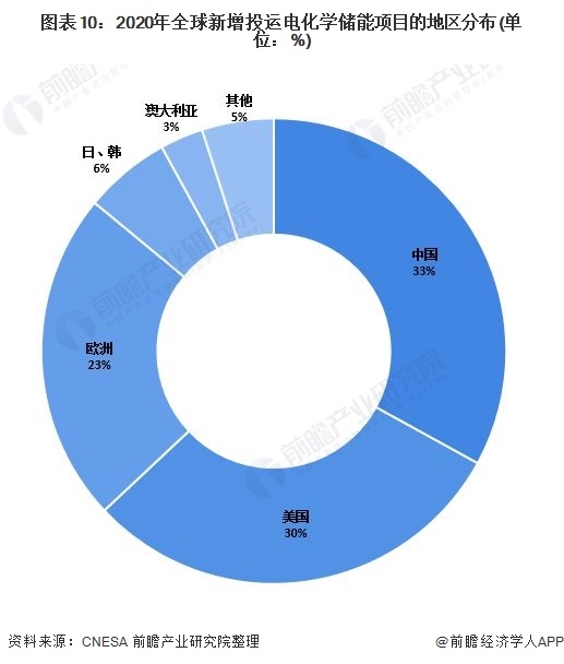 2020年,儲(chǔ)能行業(yè)雖遭受嚴(yán)重影響,但經(jīng)歷上半年的低迷之后,市場(chǎng)逐漸回暖,新增投運(yùn)儲(chǔ)能項(xiàng)目,特別是電化學(xué)儲(chǔ)能項(xiàng)目的裝機(jī)規(guī)模逆勢(shì)而長(zhǎng)。其中,中國(guó)、美國(guó)和歐洲占據(jù)了全球電化學(xué)儲(chǔ)能市場(chǎng)的主導(dǎo)地位,三者合計(jì)占全球電化學(xué)新增投運(yùn)總規(guī)模的86%。