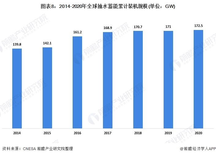 2015-2020年,全球抽水蓄能的累計(jì)裝機(jī)規(guī)模呈增長(zhǎng)趨勢(shì)。截至2020年底,全球抽水學(xué)能累計(jì)裝機(jī)規(guī)模為172.5GW,同比增長(zhǎng)0.9%。在全球儲(chǔ)能市場(chǎng)上占據(jù)領(lǐng)先地位。
