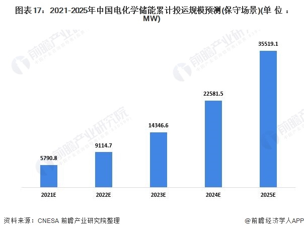 在保守場(chǎng)景下,“十四五”期間是儲(chǔ)能探索和實(shí)現(xiàn)市場(chǎng)“剛需”應(yīng)用、系統(tǒng)產(chǎn)品化和獲取穩(wěn)定商業(yè)利益的重要時(shí)期,2021-2025年電化學(xué)儲(chǔ)能規(guī)模將以57.4%的復(fù)合增長(zhǎng)率增長(zhǎng),到2025年累計(jì)投運(yùn)規(guī)模有望達(dá)到35.52GW。