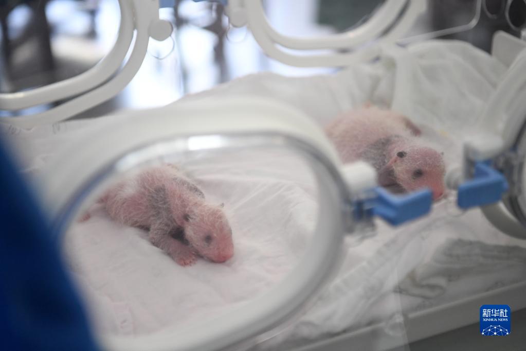 9月23日,重慶動物園工作人員在大熊貓館育幼室內(nèi)照顧雙胞胎幼仔。
