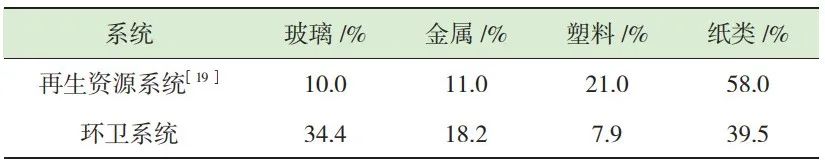 可回收物理論上包括各類可以回收利用的組分,一些組分具有較高的市場售價,往往進入再生資源系統(tǒng)。而另一些組分可以回收但市場價格較低,需要環(huán)衛(wèi)系統(tǒng)進行兜底回收。表 3為進入再生資源系統(tǒng)和環(huán)衛(wèi)系統(tǒng)的玻金塑紙的比例,可以看出環(huán)衛(wèi)系統(tǒng)回收的玻璃等低值可回收物的數(shù)量要明顯高于再生資源系統(tǒng),而紙類和塑料則相反?!皟删W(wǎng)”融合與規(guī)范回收是許多城市垃圾分類工作的重點,一方面推動管理機制融合,另一方面加快回收設(shè)施的融合和數(shù)據(jù)的共享。