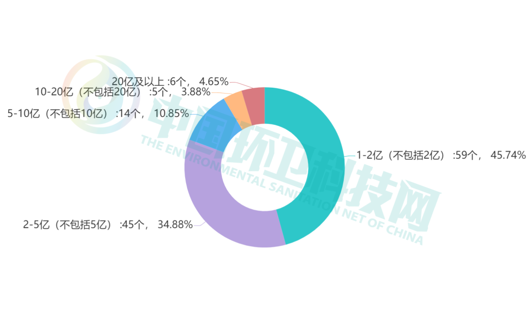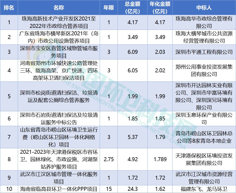 據(jù)統(tǒng)計,9個月內(nèi)共有129個億級環(huán)衛(wèi)項目開標,總金額達561.33億元。單個項目中標金額最高達47.27億,年化金額最高為3.49億/年,項目來自25個省/直轄市/自治區(qū),其中廣東省開標個數(shù)最多,安徽省開標總金額最高。來源 | 環(huán)衛(wèi)科技網(wǎng)(ID: cnhuanwei)9個月的激烈競爭之后,2021年環(huán)衛(wèi)市場即將迎來最后的沖刺期。縱觀前三季度,民企收獲滿滿的同時,國資來勢兇猛,屢次拿下億級項目,更有一部分國企憑借手中的大型項目躋身2021年前三季度拿標top10。同時,各大頭部環(huán)企在垃圾分類、海上環(huán)衛(wèi)業(yè)務等方面各有突破,業(yè)態(tài)布局走向更豐富多元。據(jù)統(tǒng)計,9個月內(nèi)共有129個億級環(huán)衛(wèi)項目開標,總金額達561.33億元。單個項目中標金額最高達47.27億,年化金額最高為3.49億/年,項目來自25個省/直轄市/自治區(qū),其中廣東省開標個數(shù)最多,安徽省開標總金額最高。1月-9月億級環(huán)衛(wèi)項目中標個數(shù)分別為21個、14個、20個、13個、9個、14個、15個、8個、15個,中標金額分別為184.89億元、57.67億元、58.71億元、32.39億元、21.62億元、52.36億元、66.94億元、44.15億元、42.6億元。1、數(shù)據(jù)來源于中國政府采購網(wǎng)及各地方政府采購網(wǎng);2、版權歸環(huán)衛(wèi)科技網(wǎng)所有,未經(jīng)書面授權,禁止轉(zhuǎn)載。在一月份高達184.89億總開標金額的襯托下,后面8個月顯得尤其低調(diào),其中以五月份開標項目最少、總金額最低。9個月來,億級項目的個數(shù)、金額整體都呈下降趨勢,與第二季度相比,第三季度整體略有回溫。在開標的129個項目中,以中標金額為標準劃分,1-2億及2-5億元的項目分別有59個、45個,也就是說,5億以下的項目占據(jù)了總項目個數(shù)的80.62%。同時,10億以上的項目僅為11個,占全部項目的8.53%。1、數(shù)據(jù)來源于中國政府采購網(wǎng)及各地方政府采購網(wǎng);2、版權歸環(huán)衛(wèi)科技網(wǎng)所有,未經(jīng)書面授權,禁止轉(zhuǎn)載。截至9月底,今年總服務費最高的項目為1月發(fā)布的安徽省六安市舒城縣城鄉(xiāng)環(huán)衛(wèi)一體化特許經(jīng)營項目,服務期30年,總服務費超47億元,中標人為人和環(huán)境、軒昂環(huán)保。與2020年相比,今年還未出現(xiàn)能與新橋和沙井街道環(huán)衛(wèi)項目(中標額70億元),新安、福永和福海街道環(huán)衛(wèi)項目(中標額84億元)等比肩的超大環(huán)衛(wèi)項目。如下圖所示,所有項目中服務期2-3年的項目個數(shù)最多,共計63個,約占項目總個數(shù)的48.84%。1、數(shù)據(jù)來源于中國政府采購網(wǎng)及各地方政府采購網(wǎng);2、版權歸環(huán)衛(wèi)科技網(wǎng)所有,未經(jīng)書面授權,禁止轉(zhuǎn)載。在服務期3年以下的項目中,中標金額最大的項目為深圳市寶安區(qū)直管區(qū)域物管城市服務項目,3年服務費共計6.09億元,中標人為深圳市平通工程有限公司。中標金額最小的為山東省東營市利津縣城鄉(xiāng)環(huán)衛(wèi)一體化保潔及垃圾收轉(zhuǎn)運項目,3年服務費約為1億元,中標人為康潔科技集團有限公司。目前,除卻“特許經(jīng)營”類的項目,服務期在2-3年的環(huán)衛(wèi)項目明顯更受青睞,筆者分析,服務期低于2年的項目,容易出現(xiàn)剛熟悉項目情況就匆忙退場的“尷尬”,相對來說,2-3年是一個相對不局促,又比較靈活的時長。129個項目中,年化金額最高的項目為今年6月底開標的廣東省珠海高新技術產(chǎn)業(yè)開發(fā)區(qū)2021至2022年市政綜合管養(yǎng)項目,服務期1年,服務費4.17億元,中標人為珠海高華市政綜合管理有限公司(實控人為珠海高新技術產(chǎn)業(yè)開發(fā)區(qū)國有資產(chǎn)管理辦公室)。年化金額最低的項目為廣州市白云區(qū)鶴龍街鶴邊村智慧環(huán)衛(wèi)建設、運營一體化服務項目,服務期10年,總服務費僅為1.08億元,年化金額1080萬元;中標人為廣州市中許智能化科技有限公司(牽頭人)與中國通信建設第四工程局有限公司(成員方)組成的聯(lián)合體。以下為前三季度億級項目的年化金額TOP10榜單,排名前四的項目,年化金額都在2億以上,位列最后一名的海南省臨高縣環(huán)衛(wèi)一體化PPP項目,年化金額也高達1.62億元。