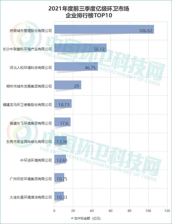 值得一提的是,廣東省今年環(huán)境衛(wèi)生工作的重點放在了末端領域:4月份,廣東省人民政府印發(fā)《廣東省國民經(jīng)濟和社會發(fā)展第十四個五年規(guī)劃和2035年遠景目標綱要》(以下簡稱《綱要》)?!毒V要》指出,要深入踐行生態(tài)文明理念,加快建設美麗廣東。引導居民自覺實施生活垃圾分類,推行生活垃圾減量化、資源化、無害化;加快生活垃圾處理設施建設,提高焚燒處理比例;推動固體廢物源頭減量化、全過程監(jiān)管,提升利用處置能力。到2025年,城市生活垃圾無害化處理率達到99%以上。因此,今年廣東省垃圾焚燒項目上馬規(guī)模大增,一改前兩年排名十名開外的局勢:截至目前,廣東省共開標5個生活垃圾焚燒項目,處理規(guī)模合計8550噸/日,較去年全年增長1325%。安徽省在本時間段內(nèi),開標億級環(huán)衛(wèi)項目數(shù)量位居第三,總中標金額位居第一。這與其近年來在城市管理等領域發(fā)布的政策密不可分。2019年10月,安徽省人民政府發(fā)布關于進一步加強城市精細化管理工作的指導意見,其中明確提到加強城市環(huán)境衛(wèi)生治理。大力推進城市道路清掃保潔工作市場化、專業(yè)化、標準化。加大道路清掃保潔機械化作業(yè)推進力度,到2020年年底,設區(qū)的市建成區(qū)機械化清掃率達到80%以上,縣城達到65%以上。城市重點區(qū)域全面實施道路濕掃、吸掃作業(yè)。截至目前,安徽省已開標2個超20億環(huán)衛(wèi)項目:亳州市利辛縣城鄉(xiāng)環(huán)衛(wèi)一體化工程項目及六安市舒城縣城鄉(xiāng)環(huán)衛(wèi)一體化特許經(jīng)營項目,金額大,服務年限長,這也是安徽省目前金額領先其余省份的原因之一。在安徽省有所斬獲的企業(yè),除我們眼熟的僑銀股份、康潔集團、盈峰中聯(lián)之外,也有當?shù)丨h(huán)企及物業(yè)企業(yè)如雅生活、嘉誠物業(yè)等。根據(jù)環(huán)衛(wèi)科技網(wǎng)統(tǒng)計,2021年前三季度中標金額排名前三的企業(yè)為僑銀股份、盈峰環(huán)境、人和環(huán)境。1、數(shù)據(jù)來源于中國政府采購網(wǎng)及各地方政府采購網(wǎng);2、版權歸環(huán)衛(wèi)科技網(wǎng)所有,未經(jīng)書面授權,禁止轉(zhuǎn)載。與半年度盤點相比,前三名并無變化,但TOP10榜單出現(xiàn)了半年榜沒有的三位新面孔:朔州市城市發(fā)展集團有限公司、廣州環(huán)投環(huán)境集團有限公司及大連東晨環(huán)境清潔有限公司,三家企業(yè)皆是憑借新入手的十億級環(huán)衛(wèi)項目躋身前十。其中,朔州市城市發(fā)展集團有限公司、廣州環(huán)投環(huán)境集團有限公司均為國企,也是本年前三季度榜單上唯二的國企。截至9月30日,今年僑銀股份億級項目中標額約為106.82億元,穩(wěn)坐榜單第一。僑銀股份今年收獲多個億級、十億級環(huán)衛(wèi)一體化項目,成績喜人。7月21日,僑銀股份在預中標2.87億元的江西省南昌市青云譜區(qū)環(huán)衛(wèi)作業(yè)市場化服務采購項目(一標段)后,成功突破百億大關,成為本年度第一個合同金額破百億的企業(yè)。今年,在碳中和目標下,垃圾分類作為節(jié)能減排的重要手段,市場化發(fā)展加速。作為最早響應垃圾分類的企業(yè)之一,僑銀股份在垃圾分類全鏈條服務、智慧化管理和資源化利用方面都有成功案例。今年,在“碳中和”加持下,僑銀股份競投“碳中和”垃圾分類項目首戰(zhàn)告捷:9月7日,僑銀股份聯(lián)合全資子公司預中標佛山市禪城區(qū)垃圾分類全覆蓋服務項目,項目總金額約1.16億元。引領智慧環(huán)衛(wèi)高速發(fā)展盈峰環(huán)境前三季度共中標7個億級環(huán)衛(wèi)項目,總金額約56.12億元。在積極拓展傳統(tǒng)環(huán)衛(wèi)業(yè)務的同時,盈峰環(huán)境今年首次揚帆海上:9月10日,三亞市天涯區(qū)“海上環(huán)衛(wèi)保潔作業(yè)項目”正式簽約,并于9月15日順利進場,公司正式邁入“海域保潔”新時代。今年以來,盈峰環(huán)境在智慧環(huán)衛(wèi)領域?qū)耀@成果:年初,盈峰環(huán)境中標價值38億的湘潭市環(huán)衛(wèi)一體化項目,鞏固了進一步完善了“智能裝備、智慧服務、智云平臺”的智慧環(huán)衛(wèi)戰(zhàn)略布局。此外,盈峰環(huán)境還積極尋求對外合作,實現(xiàn)強強聯(lián)合。1月,盈峰環(huán)境與美的物業(yè)在佛山簽署戰(zhàn)略合作協(xié)議,雙方將在智慧清潔示范性社區(qū)的打造以及城市運營服務等方面通過硬件設備與管理系統(tǒng)的優(yōu)勢結合,共同開發(fā)城市服務業(yè)務。9月8日,盈峰環(huán)境聯(lián)合發(fā)起的低速無人駕駛產(chǎn)業(yè)聯(lián)盟正式成立,盈峰環(huán)境聯(lián)合中國低速無人駕駛各產(chǎn)業(yè)鏈主流企業(yè),發(fā)起成立低速無人駕駛產(chǎn)業(yè)聯(lián)盟,共同打造國內(nèi)首家低速場景無人駕駛解決方案綜合性服務平臺。作為無人環(huán)衛(wèi)智能裝備領域的先行者之一,盈峰環(huán)境有力推動了低速無人駕駛在環(huán)衛(wèi)服務場景的應用,目前,公司已成功掌握無人環(huán)衛(wèi)智能裝備這一代表行業(yè)發(fā)展方向的領先技術,并獲得環(huán)衛(wèi)領域政府發(fā)放的第一張無人駕駛路測牌照。人和環(huán)境前三季度共中標4個億級環(huán)衛(wèi)項目,中標金額合計約為46.75億元,四個項目中標時間均集中在第一季度,1月份,人和環(h