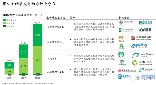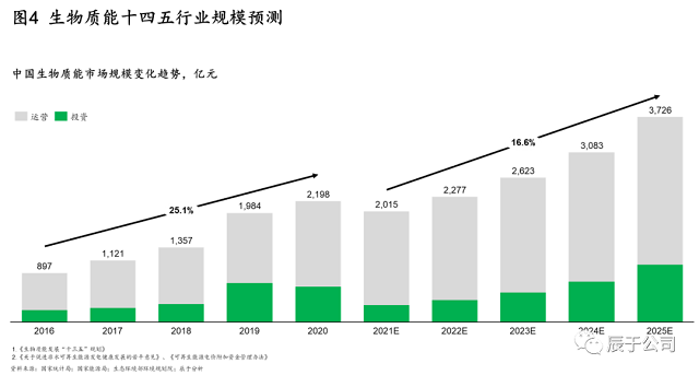 辰于預(yù)測,隨著“30·60”雙碳目標(biāo)引導(dǎo)下的能源革命和能源轉(zhuǎn)型,以及相關(guān)政策支持(例如明確對存量、增量的生物質(zhì)發(fā)電項目將按照新增不欠的原則由國家繼續(xù)給予電價補貼,并鼓勵金融機構(gòu)按照市場化原則對列入補助項目清單的企業(yè)予以支持),生物質(zhì)能市場“十四五”期間的投資和運營規(guī)模將持續(xù)提升,復(fù)合增長率16.6%,到2025年達(dá)到3700億元規(guī)模(見圖4)。投資方面,預(yù)計生物天然氣投資額最高,增長也最快;運營方面,生物質(zhì)發(fā)電占比最高,但生物天然氣的增速最快。