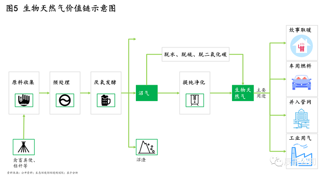 生物天然氣是指通過對秸稈、人畜糞便等生物質(zhì)經(jīng)過發(fā)酵形成沼氣后,進一步提純獲得的天然氣,作為天然氣的替代品用于家庭炊事取暖、車用燃料、工業(yè)用氣等領(lǐng)域,它的價值鏈較長(見圖5)。