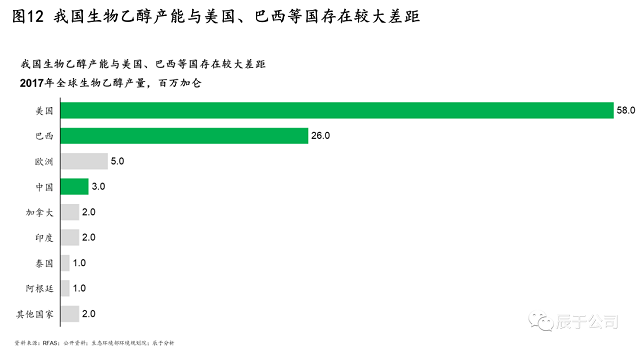 我國發(fā)展生物乙醇的總思路是“核準(zhǔn)生產(chǎn)、定向流通、封閉運行、有序發(fā)展”,生物乙醇的生產(chǎn)、流通、銷售等都在嚴(yán)格限制范圍內(nèi)進行,目標(biāo)到2025年達(dá)到688萬噸產(chǎn)量(2020年400萬噸)。但這一數(shù)字與美國、巴西等國家相比差距較遠(yuǎn),2017年全球生物乙醇產(chǎn)量中,中國的產(chǎn)量只有美國的二十分之一(見圖12)。