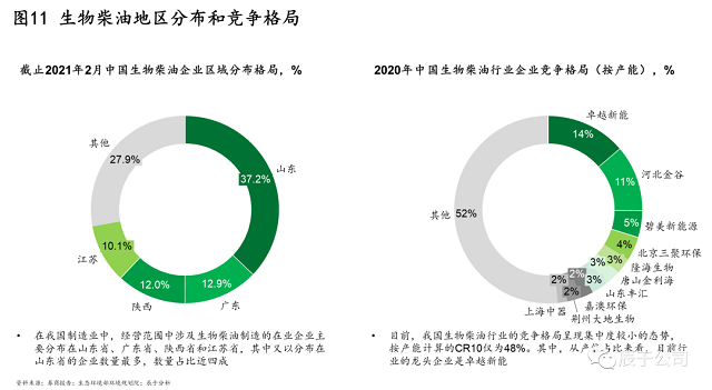 在銷售應(yīng)用上,國內(nèi)的主要渠道是出口、交通燃料、化工等,出口是拉動行業(yè)發(fā)展的主要渠道,2019年出口占產(chǎn)量的比例達(dá)到80%。國內(nèi)需求的打開是行業(yè)發(fā)展的最大希冀,其中最有望打開的市場是交通燃料領(lǐng)域——生物柴油強制添加政策。部分城市已經(jīng)開始在試點,上海市2013年開始在公交車上實行B5標(biāo)準(zhǔn)(添加比例5%)。現(xiàn)在國家已開始全國范圍進行B5 強制添加標(biāo)準(zhǔn)的意見征求,并有望隨著雙碳目標(biāo)深入推進提升到B10。若政策落地實施,將產(chǎn)生450萬噸~1000萬噸的產(chǎn)能缺口。