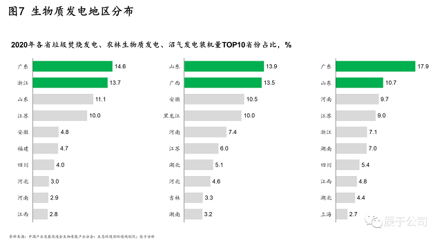 在地區(qū)分布上,各類型的生物質(zhì)發(fā)電集中于華東華南地區(qū),但各地區(qū)側(cè)重點有所不同。截至2020年底,垃圾焚燒發(fā)電集中在廣東省、浙江省、山東省、江蘇省、安徽省等地區(qū),合計占全國累計裝機容量的54%;農(nóng)林生物質(zhì)發(fā)電主要集中于山東省、湖北省、安徽省、黑龍江省、河南省,合計占比達(dá)到55.3%;沼氣發(fā)電主要集中于廣東省、山東省、河南省、江蘇省、浙江省,合計占比達(dá)到54.3%(見圖7)。