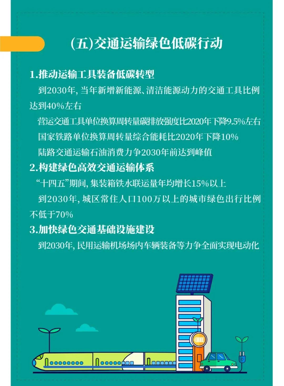 2.構(gòu)建綠色高效交通運(yùn)輸體系。發(fā)展智能交通,推動(dòng)不同運(yùn)輸方式合理分工、有效銜接,降低空載率和不合理客貨運(yùn)周轉(zhuǎn)量。大力發(fā)展以鐵路、水路為骨干的多式聯(lián)運(yùn),推進(jìn)工礦企業(yè)、港口、物流園區(qū)等鐵路專用線建設(shè),加快內(nèi)河高等級(jí)航道網(wǎng)建設(shè),加快大宗貨物和中長距離貨物運(yùn)輸“公轉(zhuǎn)鐵”、“公轉(zhuǎn)水”。加快先進(jìn)適用技術(shù)應(yīng)用,提升民航運(yùn)行管理效率,引導(dǎo)航空企業(yè)加強(qiáng)智慧運(yùn)行,實(shí)現(xiàn)系統(tǒng)化節(jié)能降碳。加快城鄉(xiāng)物流配送體系建設(shè),創(chuàng)新綠色低碳、集約高效的配送模式。打造高效銜接、快捷舒適的公共交通服務(wù)體系,積極引導(dǎo)公眾選擇綠色低碳交通方式?!笆奈濉逼陂g,集裝箱鐵水聯(lián)運(yùn)量年均增長15%以上。到2030年,城區(qū)常住人口100萬以上的城市綠色出行比例不低于70%。
