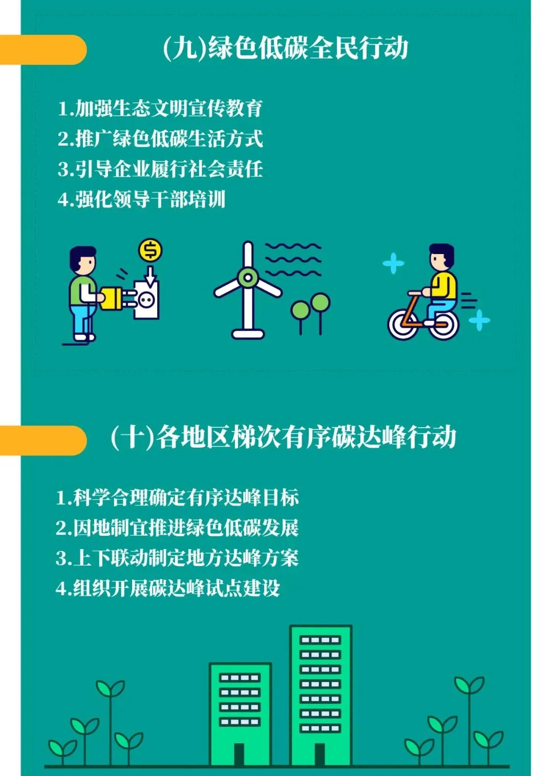 將碳達(dá)峰貫穿于經(jīng)濟(jì)社會(huì)發(fā)展全過程和各方面,重點(diǎn)實(shí)施能源綠色低碳轉(zhuǎn)型行動(dòng)、節(jié)能降碳增效行動(dòng)、工業(yè)領(lǐng)域碳達(dá)峰行動(dòng)、城鄉(xiāng)建設(shè)碳達(dá)峰行動(dòng)、交通運(yùn)輸綠色低碳行動(dòng)、循環(huán)經(jīng)濟(jì)助力降碳行動(dòng)、綠色低碳科技創(chuàng)新行動(dòng)、碳匯能力鞏固提升行動(dòng)、綠色低碳全民行動(dòng)、各地區(qū)梯次有序碳達(dá)峰行動(dòng)等“碳達(dá)峰十大行動(dòng)”。