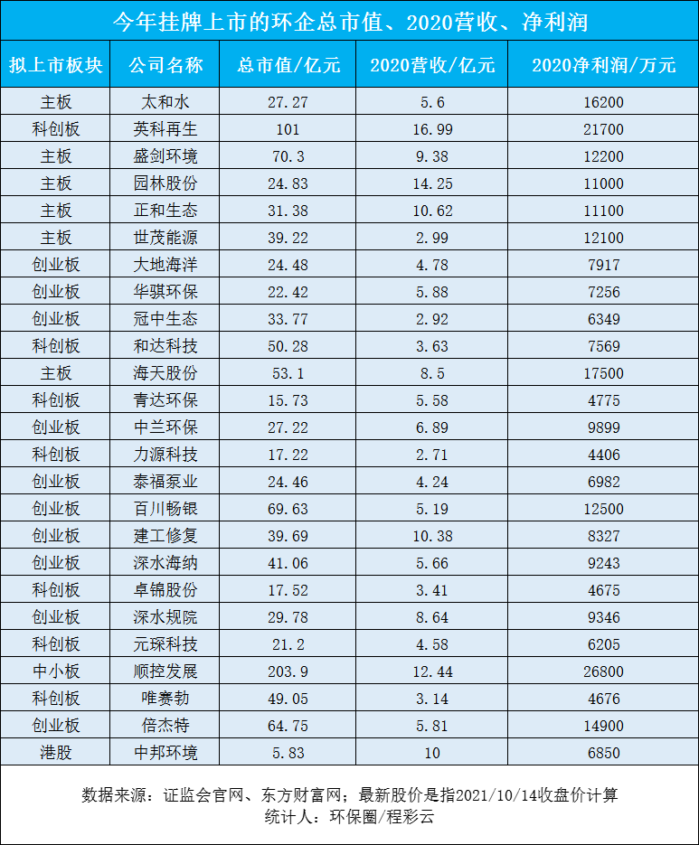 縱觀環(huán)保行業(yè)20年發(fā)展史,早期一批靠工程bot項(xiàng)目推動(dòng)產(chǎn)業(yè)紅利的,大多在2015年前后就已經(jīng)上市了,要么赴港上市,要么A股主板,這些早期上市的環(huán)保老兵大都享受到環(huán)境基礎(chǔ)設(shè)施補(bǔ)短板的政策紅利,恰好趕上供水設(shè)施、市政污水、垃圾焚燒大舉建設(shè)的好時(shí)候。規(guī)模做到一定程度,上市就變成水到渠成的事情了。而如今上市的環(huán)保企業(yè),無(wú)論是主板,還是創(chuàng)業(yè)板、科創(chuàng)板,都有一個(gè)共性,就是大都是給早期工程項(xiàng)目做配套、做服務(wù)、做運(yùn)營(yíng)的企業(yè),這些企業(yè)伴隨著“前輩們”成長(zhǎng),他們自身也在壯大。所以我們看到近兩年上市的企業(yè),既是環(huán)保行業(yè)非常細(xì)分的子領(lǐng)域,也是產(chǎn)業(yè)下游設(shè)備技術(shù)廠商,做膜、水泵、生物濾池、勘測(cè)設(shè)計(jì)、水質(zhì)監(jiān)測(cè)、垃圾滲濾液、填埋氣治理的都紛紛登錄資本市場(chǎng)(如下圖)。此外,環(huán)保企業(yè)紛紛上市還跟當(dāng)前較為寬松的IPO審核環(huán)境有關(guān),也就是筆者多次提到的“注冊(cè)制改革”,不僅簡(jiǎn)化了上市流程,而且對(duì)公司營(yíng)收、凈利潤(rùn)等硬性財(cái)務(wù)指標(biāo)要求放寬不少,準(zhǔn)入門(mén)檻大大降低。到底有多寬松,以大火的科創(chuàng)板為例,根據(jù)2020年3月上交所頒布的《科創(chuàng)板企業(yè)發(fā)行上市申報(bào)及推薦暫行規(guī)定》(下稱(chēng)《暫行規(guī)定》),對(duì)于即將IPO科創(chuàng)板企業(yè),其財(cái)務(wù)指標(biāo)可以“五選一”,比原來(lái)寬松不少。我們以2020年科創(chuàng)板上市的環(huán)保企業(yè)分析,絕大多數(shù)企業(yè)凈利潤(rùn)約在4千萬(wàn)-8千萬(wàn)之間,凈利潤(rùn)最低當(dāng)屬武漢路德環(huán)境,2019年歸母凈利潤(rùn)4406萬(wàn)元,加上2018年凈利潤(rùn)1829萬(wàn)元,剛過(guò)了科創(chuàng)板規(guī)定累計(jì)凈利潤(rùn)不低于5千萬(wàn)的上會(huì)門(mén)檻。此外,不乏還有營(yíng)收和凈利潤(rùn)下滑的過(guò)會(huì)企業(yè),如濟(jì)南恒譽(yù)環(huán)保和青島達(dá)能環(huán)保,2019年?duì)I業(yè)收入和凈利潤(rùn)均出現(xiàn)下滑,今年上市膜企唯賽勃也是,2020年歸母凈利潤(rùn)下滑三成至4674萬(wàn)元。這些都說(shuō)明了只要企業(yè)沒(méi)有硬傷,都能IPO,上市不再是遙不可及的夢(mèng)。資本漠視、支付能力下滑、紅利期縮短