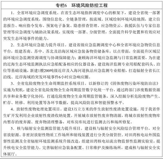 加強環(huán)境風險源頭防控。多層級開展突發(fā)生態(tài)環(huán)境事件風險評估,2025年底前,完成省級突發(fā)生態(tài)環(huán)境事件風險評估,繪制全省重點環(huán)境風險“一張圖”。強化區(qū)域開發(fā)和項目建設的環(huán)境風險評價,對涉及有毒有害化學品、重金屬和新污染物的項目,實行最嚴格的環(huán)境準入。常態(tài)化推進環(huán)境風險企業(yè)突發(fā)事件生態(tài)環(huán)境風險隱患排查,實施分級分類動態(tài)管理。有效提升涉危涉重工業(yè)園區(qū)環(huán)境應急管理水平,完成園區(qū)突發(fā)生態(tài)環(huán)境事件三級防控體系建設。以長江、太湖、大運河、集中式飲用水水源地以及化工園區(qū)周邊重點水域等敏感目標為重點,開展水環(huán)境安全工程建設。到2025年,全面建成“1+13+N”重點敏感保護目標突發(fā)水污染事件應急防范體系,確保重點流域水環(huán)境安全。