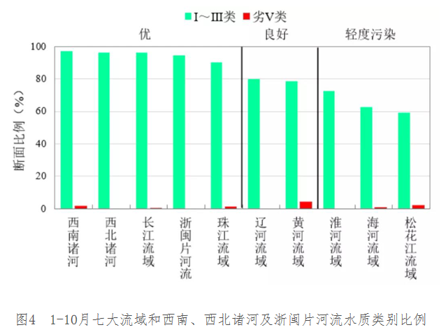 10月,長(zhǎng)江、黃河、珠江、松花江、淮河、海河、遼河等七大流域及西北諸河、西南諸河和浙閩片河流水質(zhì)優(yōu)良(Ⅰ~Ⅲ類(lèi))斷面比例為84.8%,同比下降0.5個(gè)百分點(diǎn);劣Ⅴ類(lèi)斷面比例為1.0%,同比下降0.3個(gè)百分點(diǎn)。主要污染指標(biāo)為高錳酸鹽指數(shù)、總磷和化學(xué)需氧量。其中,西南和西北諸河、長(zhǎng)江流域水質(zhì)為優(yōu);浙閩片河流、珠江、遼河、黃河和松花江流域水質(zhì)良好;淮河和海河流域?yàn)檩p度污染。