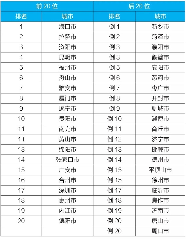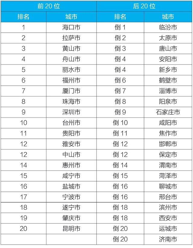 10月,168個(gè)重點(diǎn)城市中,??凇⒗_和資陽(yáng)市等20個(gè)城市空氣質(zhì)量相對(duì)較好(從第1名至第20名),新鄉(xiāng)、菏澤和濮陽(yáng)市等20個(gè)城市空氣質(zhì)量相對(duì)較差(從倒數(shù)第1名至并列倒數(shù)第20名),見(jiàn)附表3。