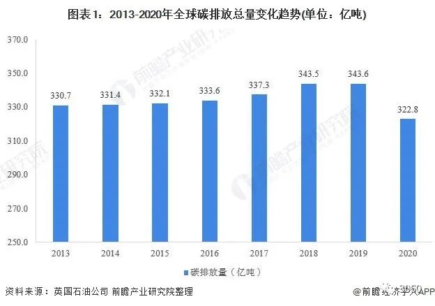 21世紀(jì)以來,全球碳排放量增長迅速,2000-2019年,全球二氧化碳排放量增加了40%。據(jù)英國石油公司(BP)發(fā)布的《世界能源統(tǒng)計(jì)年鑒(第70版)》統(tǒng)計(jì)數(shù)據(jù)顯示,2013年以來,全球碳排放量保持持續(xù)增長,2019年,全球碳排放量達(dá)343.6億噸,創(chuàng)歷史新高。2020年,受全球新冠肺炎影響,世界各地區(qū)碳排放量普遍減少,全球碳排放量下降至322.8億噸,同比下降6.3%。