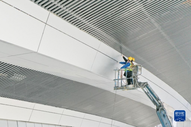 11月30日,施工人員在江蘇鹽城黃海濕地博物館金屬屋面工程現(xiàn)場(chǎng)進(jìn)行檢查(無(wú)人機(jī)照片)。