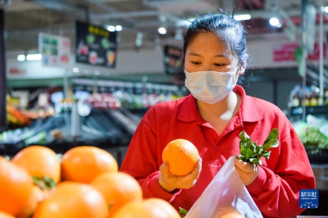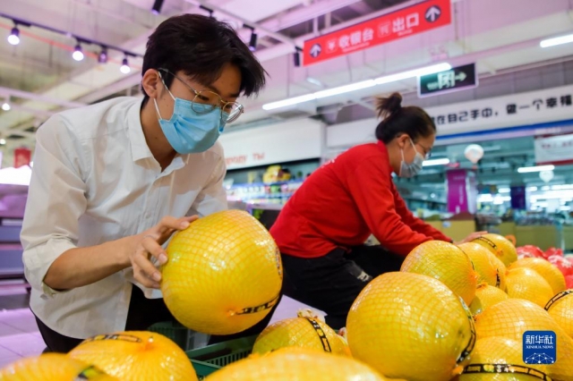 11月30日,在滿洲里市慶客隆超市,工作人員在整理水果。新華社記者 李志鵬 攝
