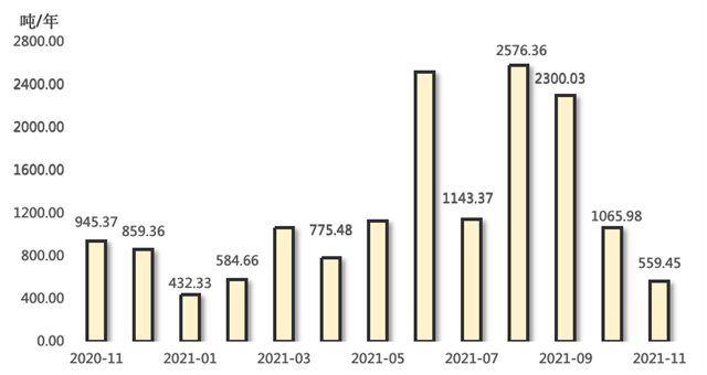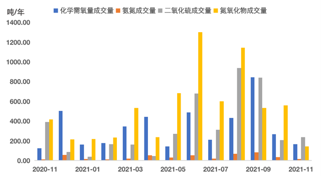 排污權(quán)成交量持續(xù)收窄,指標延續(xù)下行走勢。2021年11月,四項排污權(quán)成交量合計為559.45噸,環(huán)比下跌47.52%,與上年同期相比下降40.82%。
