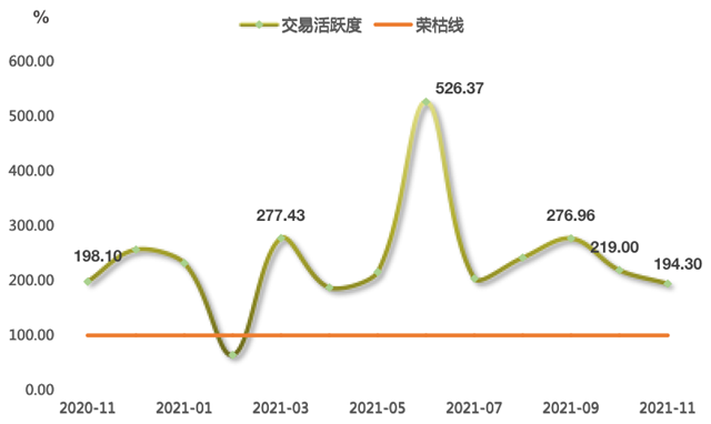浙江省排污權(quán)交易活躍度盤整下降,降幅收窄。由圖可見,交易活躍度指數(shù)延續(xù)上月兩月下行走勢后,2021年11月指數(shù)值收報于194.30點,環(huán)比下降11.28%,與上年同期相比微跌1.92%。